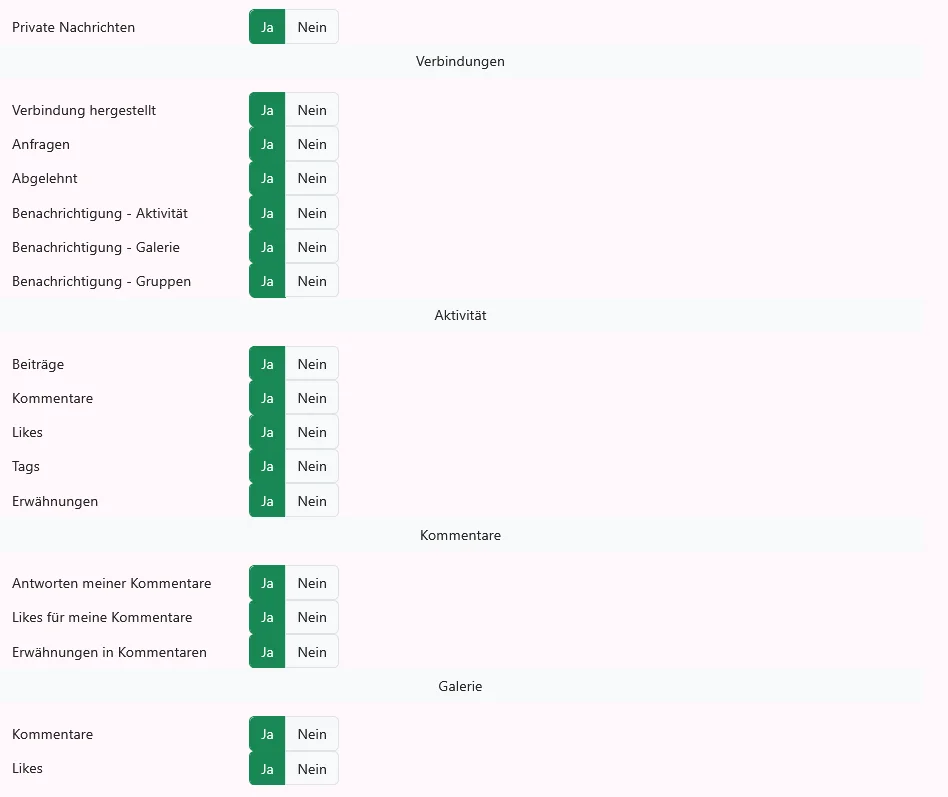 Benachrichtigung – Aktivität / Galerie / Gruppen – Du wirst über neue Aktivitäten, Bilder oder Gruppenaktionen deiner Verbindungen informiert.